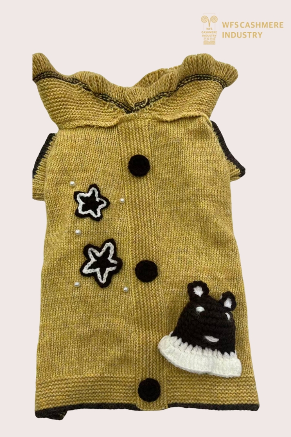 Dress your furry clients in whimsical, Instagram-worthy artisan knitwear. Our 7GG Ruffle-Collar Pet Sweater is a masterpiece of decorative handcraft. Featuring a delicate knitted ruffle collar, a hand-crocheted bear appliqué, embroidered star patches with pearl beading, and contrasting pom-pom dots—all set against a warm mustard-yellow marled body with charcoal contrast edging.