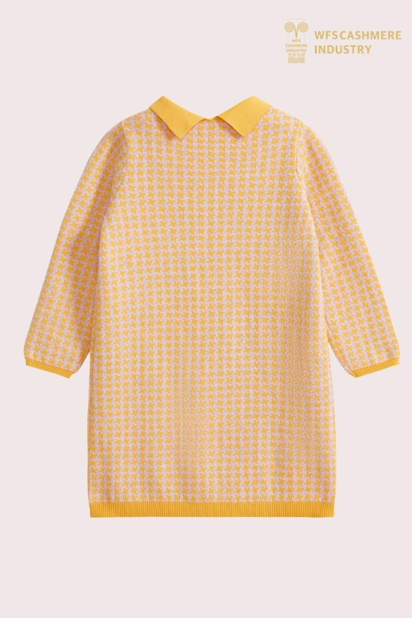 Knitwear for children requires a delicate balance of style, comfort, and safety. This mini polo dress utilizes a fine-gauge knit to create a lightweight, flexible garment that allows for unrestrictive movement. The timeless houndstooth pattern appeals to the highly profitable "Mini-Me" (matching parent-child) luxury market.